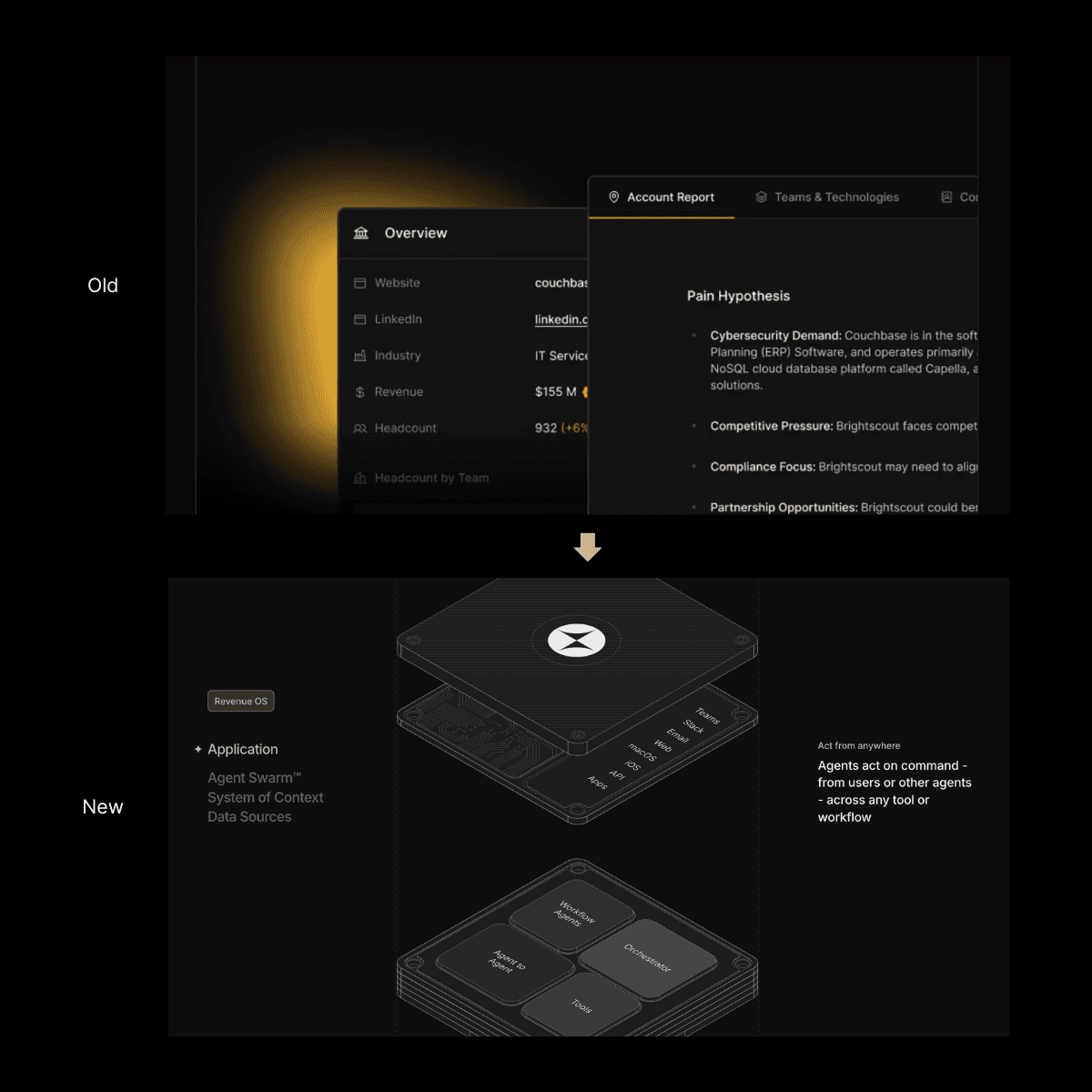The vivid gold color was intentional - a signal of ambition and energy of the team. It was designed to catch your eye. Paired with sharp edges and geometric forms, the goal was for early believers in the product to feel empowered as they deployed Rox agents to augment their workflow.